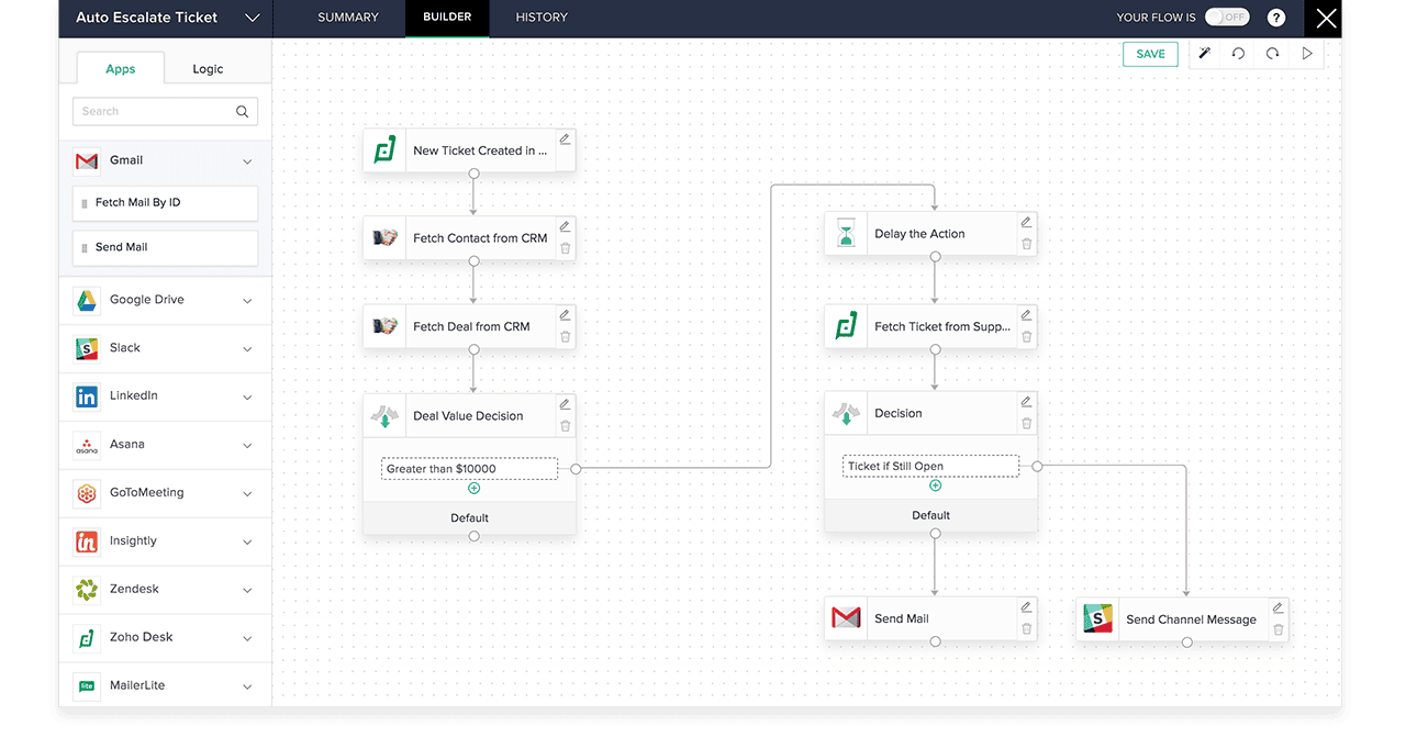 Zoho Flow is an integration platform which connects cloud applications. It helps you set up workflows to automate information exchange among the apps you use. … The action can be updating data in an app, sending an email, delaying for a specified period, or a custom function. With Zoho Flow, you can build smart integrations to break the information silos in your business.